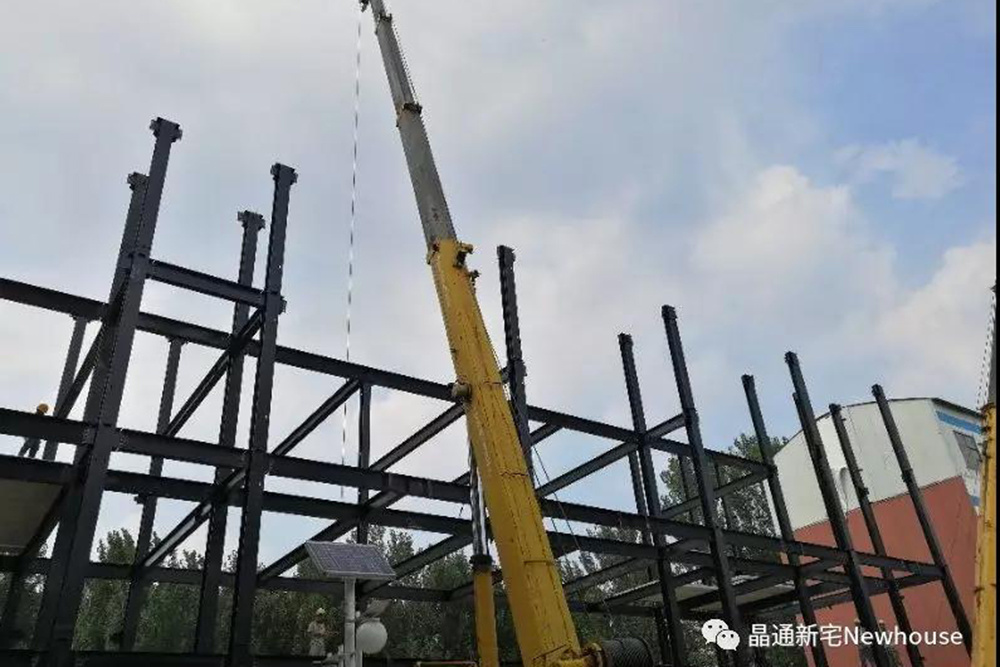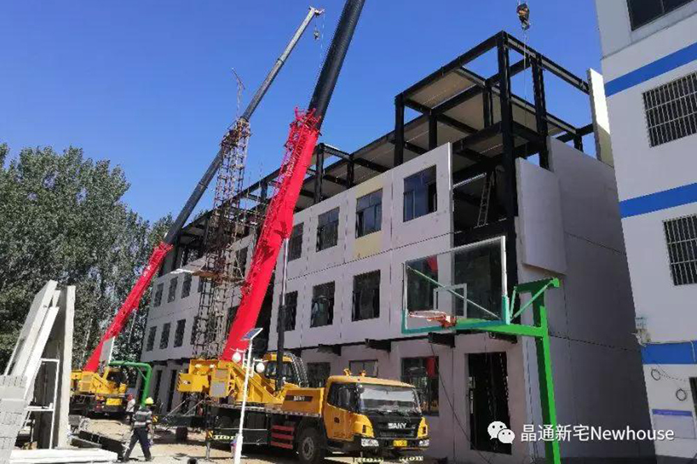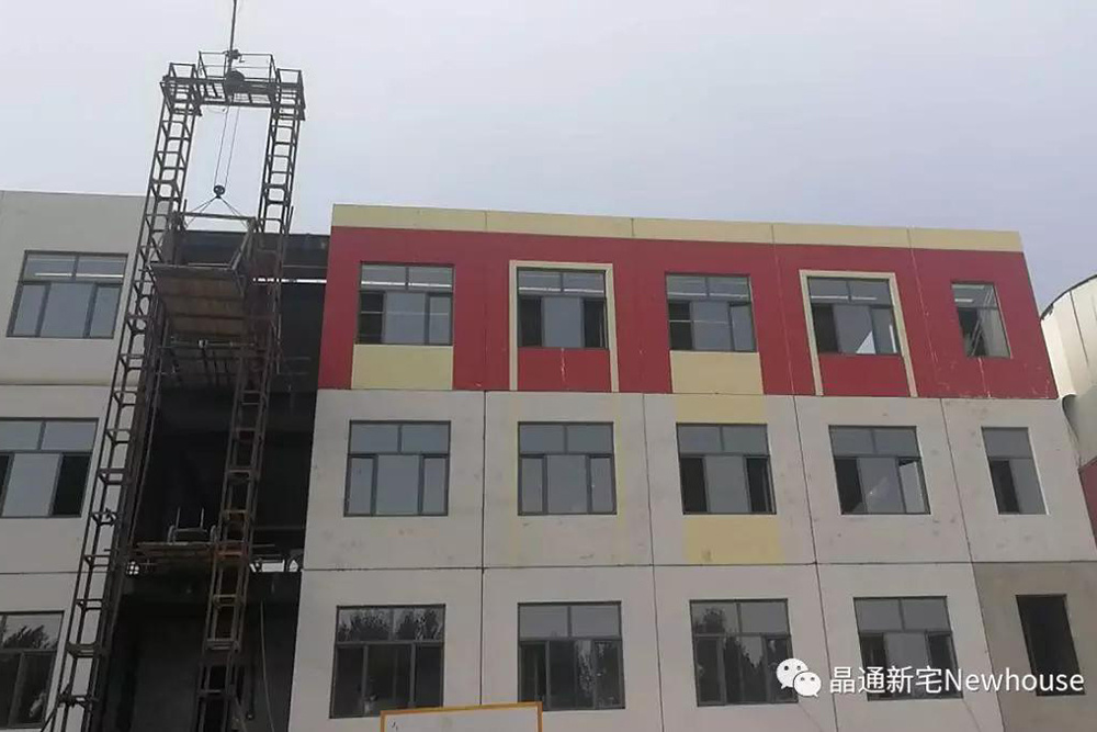 新實(shí)驗(yàn)一中項(xiàng)目共四層,總建筑面積1660㎡,采用的是晶通裝配式鋼結(jié)構(gòu)建筑體系。建設(shè)速度為平均4天一層。從基礎(chǔ)→鋼結(jié)構(gòu)框架→外墻板安裝→大跨度預(yù)應(yīng)力樓板安裝→樓梯→內(nèi)墻→室內(nèi)外裝修→屋面工程→水電安裝→完工,總共用時(shí)兩個(gè)月。充分展現(xiàn)了晶通建筑的裝配速度。